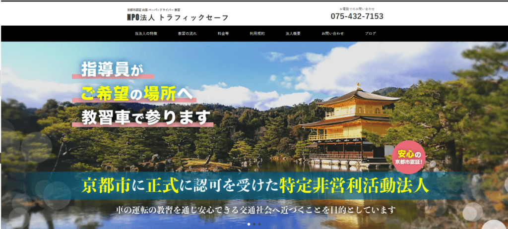 | 特徴 | NPO法人トラフィックセーフは、京都市認証の出張ペーパードライバー教習を行っております。二条自動車教習所出身の指導員が、15年の指導実績を活かし、一人ひとりに合ったカリキュラムをご提案いたします。教習車は教習所仕様のプリウスを使用し、マイカー練習には簡易補助ブレーキを装着しますので安心です。年間ご依頼数は1000件超、土日・早朝・夜間にも対応し、ご希望の場所まで出張いたします。料金は1時限(50分)5,500円から、時限数に応じてお得になるプランや初回限定プランもご用意しております。京都市内は出張無料、保険料込みの明朗会計です。運転に不安のある方の再出発はもちろん、運転見直しや就職前の実践強化にも最適です。 |