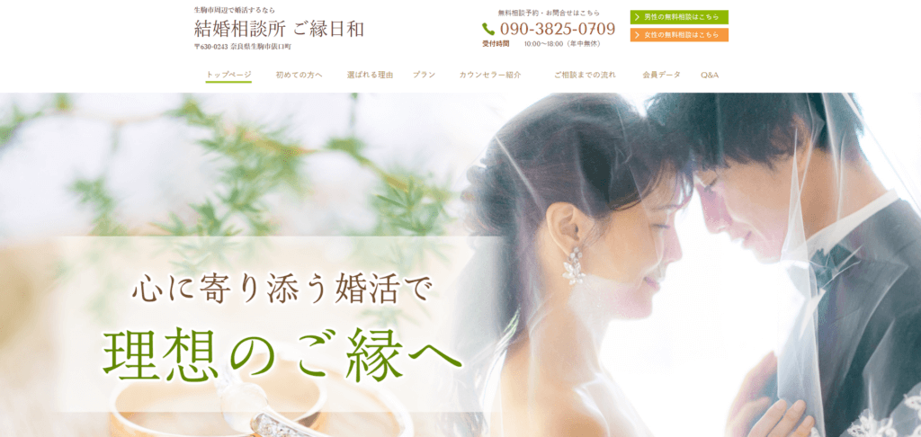 | 特徴 | 奈良で結婚相談所なら専任カウンセラーが一貫して対応する結婚相談所 ご縁日和をご利用下さい。 結婚相談所 ご縁日和は会員数101240人以上、日本最大級の結婚相談所ネットワークであるIBJの正規加盟店です! 奈良県生駒市俵口町エリアにある結婚相談所 ご縁日和は、専任カウンセラーによる婚活サポートを受けることができ、豊富な会員データベースによる効率的なマッチングと心に寄り添う安心のマンツーマンサポートで、出会いから成婚まで質にこだわったお手伝いをさせて頂いている結婚相談所です。 当相談所は、出会いの場を提供するだけでなく活動中の不安や迷いにも寄り添い、安心して婚活を進められる環境を整えています。 IBJの全国ネットワークの豊富な会員データから、希望条件や価値観に合うお相手をスピーディーにマッチングすることができ、また、独身証明書や各種身元確認書類の提出を必須としているので、信頼できる相手とのみマッチングすることができます。 生駒市立生駒台小学校や阪奈中央病院から近い場所に拠点を構える当相談所は、年中無休で10時から18時まで営業しており、奈良を中心に大阪の方でもご相談を承っておりますので、大阪の方も是非ご利用下さい。 プランは、スタンダードプラン(月会費11000円)をご用意しており、専任カウンセラーが初回カウンセリングから出会い・ご成婚までをマンツーマンで伴走し、プロフィール作成やお見合いのセッティング・交際中のサポート・プロポーズの準備まで、きめ細やかにお手伝いいたします。 また、退会後も希望に応じて結婚生活に関するご相談に対応する、アフターフォローも行います。 奈良県や大阪府の方で婚活サポートを受けたい方は、奈良県生駒市俵口町エリアにある結婚相談所 ご縁日和へご連絡下さい。詳細情報はこちら |