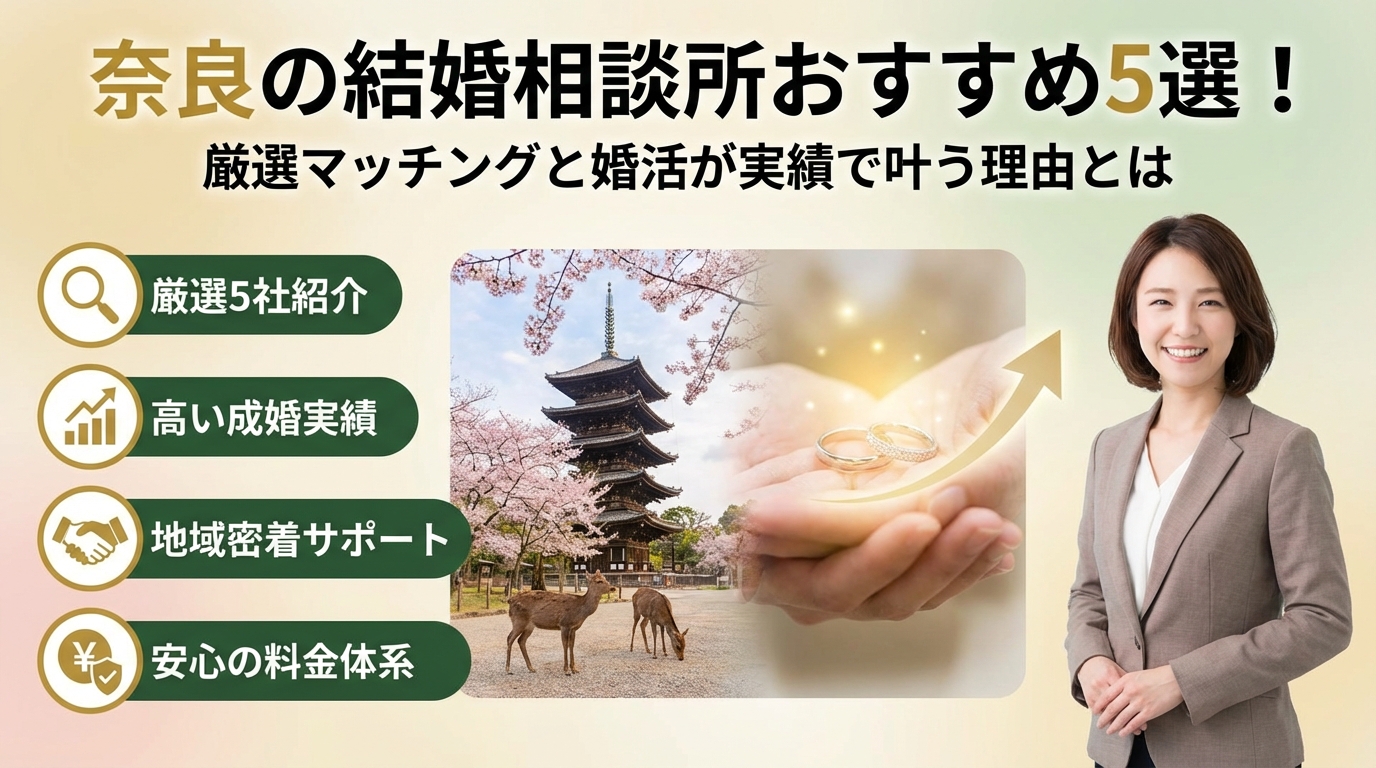 本記事では、会員ネットワークの仕組み、料金相場、紹介と検索・AIの使い分けを整理し、奈良の実情に合わせた比較軸を提示します。強引な勧誘なしで無料相談を活用するチェック項目も用意。今日からの6カ月を無駄にしない選び方を、具体的な手順でお伝えします。