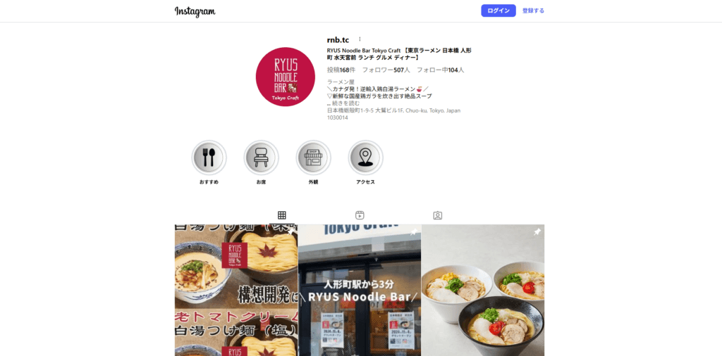 <住所> 〖人形町ラーメン〗鶏⽩湯ラーメンRYUS Noodle Bar Tokyo Craft