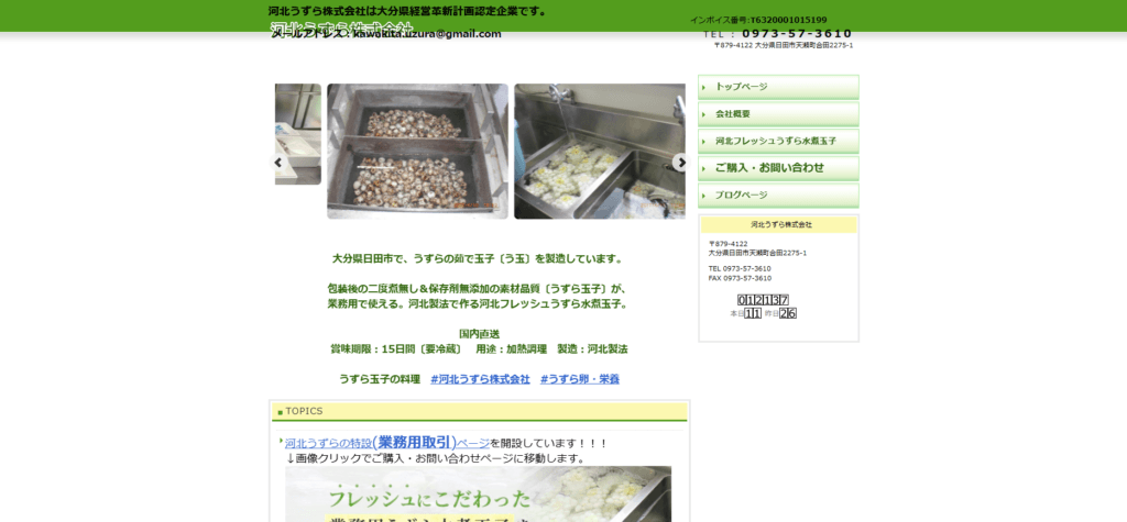 | 特徴 | 河北うずら株式会社は、大分県日田市天瀬町で、昔ながらの素朴な味わいにこだわった「フレッシュうずら水煮玉子」を製造しております。独自の河北製法により、包装後の二度煮を行わず、保存料も使用しないことで、うずら玉子本来の風味と食感をいかした商品づくりを行っています。業務用としてお使いいただける品質を追求し、要冷蔵・賞味期限15日間の水煮玉子を国内直送でお届けいたします。うどん・そばのトッピングや串揚げ、天ぷらなど、幅広いメニューにご活用いただけます。楽天市場「おんせん県おおいたオンラインショップ」や「河北うずら amazon店」、業務用食材卸サイトからもご購入いただけます。ブログやX(旧Twitter)では、レシピや最新情報も随時発信しております。今後も衛生管理と品質向上に努め、安全でおいしいうずら玉子を皆さまの食卓と飲食店様へお届けしてまいります。 |