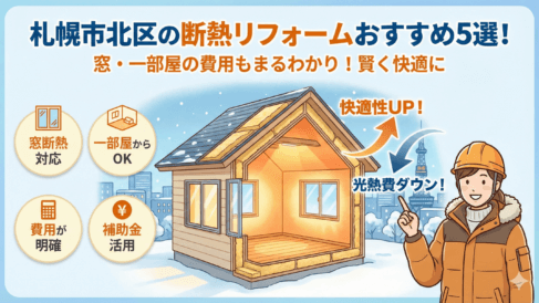 北海道札幌市北区の断熱リフォームおすすめ5選!窓断熱や一部屋断熱の費用もまるわかりで賢く選ぼう 札幌市北区の冬は、最低気温が−10℃前後まで下がる日もあり、体感温度を左右するのは窓・気密・換気のバランスです。特に窓からの熱損失は大きく、内窓や樹脂サッシで室温のムラと結露を同時に抑えられます。「どこから手を付ければいい?」「住みながら工... 2026.01.27
