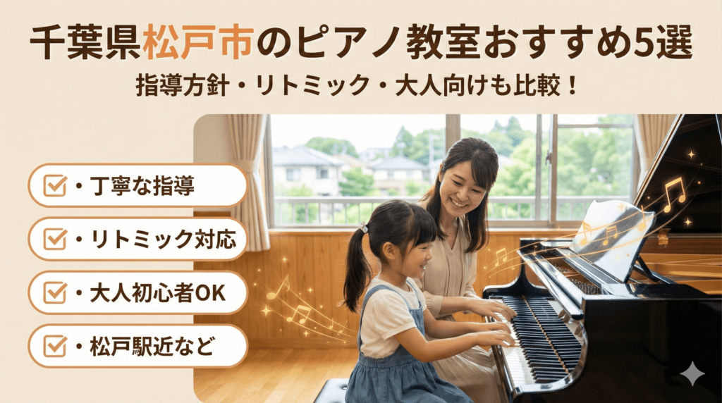千葉県松戸市で通いやすいピアノ教室を選ぶコツは、通学動線と講師の相性を同時に見ることです。まずは松戸駅や新八柱、北小金など主要駅の周辺で検索し、個人宅のピアノ教室と大手スクールの両方を候補に入れると選択肢が広がります。教室検索サイトや地図、口コミの情報を照らし合わせ、レッスンの通いやすさ講師のプロフィールコースの柔軟性を比較しましょう。大人初心者向けや子供の入門、クラシックの基礎強化、発表会やコンクール対応など、目的に合う指導スタイルがあるかを確認するのが近道です。月謝の相場や振替、体験レッスンの有無も重要で、無理なく続けられる料金練習サポートの有無が満足度を左右します。