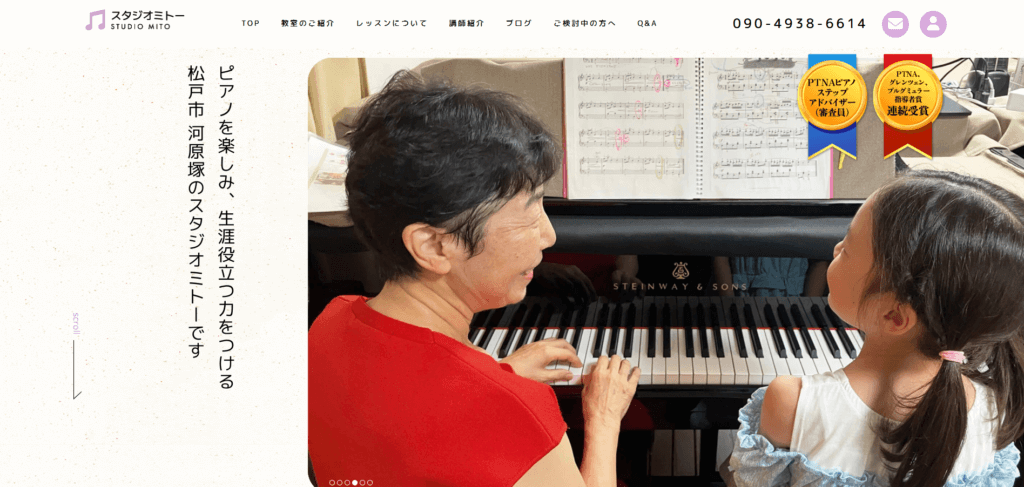 | 特徴 | スタジオミトーは、千葉県松戸市河原塚にあるピアノ教室です。「ピアノを楽しみ、生涯役立つ力をつける」ことを大切に、読譜力と表現力をバランスよく育てるレッスンを行っています。講師の御任克美(みとうかつみ)は、バスティンメソード創案者ジェーン・バスティン氏に直接指導を受け、多くのコンクールで指導者賞を受賞してきたベテラン講師です。スタジオにはスタインウェイのピアノを備え、幼児からシニアの方まで、一人ひとりに合わせたコースをご用意しております。オリジナル教材を使った楽しいレッスンと、年3回のコンサートを通して、無理なく自信を育むことができます。急なご予定や体調不良にも振替対応を行い、安心して通っていただける体制を整えています。はじめての習い事として、また大人の方の新しいチャレンジとして、「ここでピアノを弾いてみたい」と思っていただける温かな教室づくりを心がけております。 |
