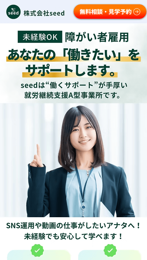 | 特徴 | 株式会社seedは大阪中央区に3つのA型事業所「トレンドクリエイツ、クリエイティブビジョン、デザインラボ」を運営しています。 A型では珍しい「SNS運用・動画編集・デザイン制作」などのクリエイティブ業務に特化した就労継続支援A型事業所です。 就労継続支援A型とは、病気や障がいがあり、今すぐ一般の会社で働くことに不安がある方が、支援を受けながら「雇用契約を結んで働く」ことができる福祉サービスです。雇用契約を結ぶため最低賃金以上の給与が保障され、働いた分の給料を受け取ることができます。体調や症状に配慮してもらえる環境が整っており、無理のない作業内容や働く時間から始められるのが特徴です。適応障がいやうつ病、不安障がい、統合失調症、発達障がいなど、見た目では分かりにくい病気を抱えている方も多く利用しています。 |