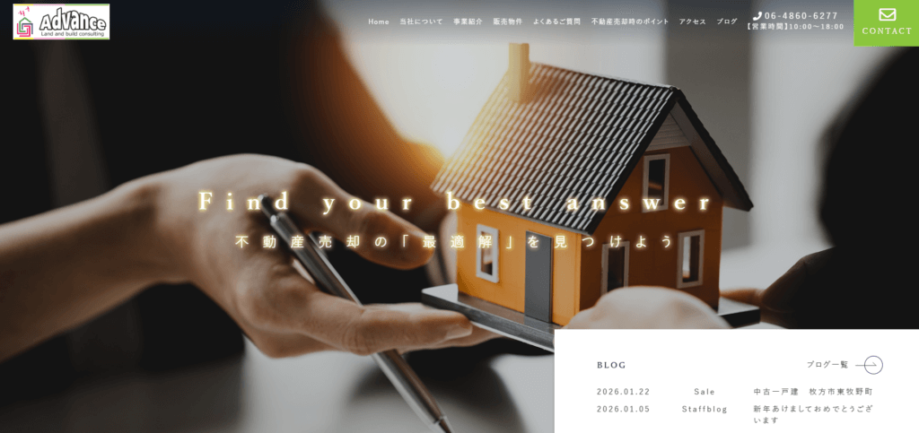 | 特徴 | 大阪府吹田市で不動産売却をご検討中の方は、株式会社Advanceにお任せくださいませ。住み替え・買い替え、相続、節税、ローン返済のお悩みなど、お一人おひとりの事情に寄り添いながら、最適な「売却のカタチ」をご提案いたします。仲介による売却はもちろん、スピード重視の買取、住宅ローンの返済が難しくなった方への任意売却にも対応しており、豊富な実績と綿密な調査に基づく価格査定が強みです。また、不動産の有効活用のご提案や賃貸マンション管理など、資産価値向上と安定経営のためのトータルサポートも行っております。近所に知られたくない、できるだけ高く売りたい、早く現金化したいなど、どのようなご要望もまずはお気軽にご相談ください。JR吹田駅から徒歩8分、地域密着のパートナーとして、満足度の高い不動産取引を実現いたします。 |