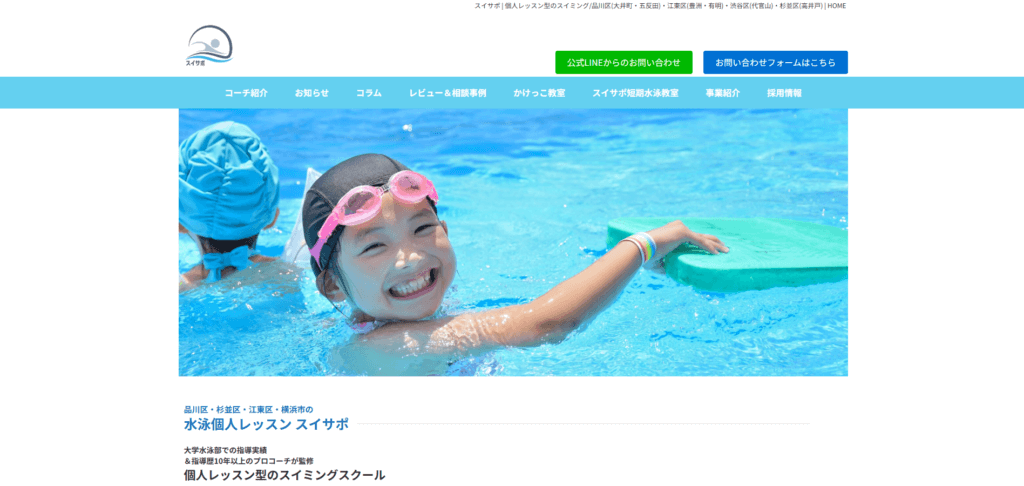 | 特徴 | スイサポは、品川区・江東区・渋谷区・杉並区・横浜市を中心に、水泳の個人レッスンを行っているスイミングスクールです。大学水泳部での指導実績や10年以上の経験を持つプロコーチが監修し、「安心」「安全」「学習」を大切にしたレッスンを提供しております。 4歳からの幼児や小中学生はもちろん、健康づくりを目的とした大人、タイム向上を目指す選手まで、一人ひとりの目標やペースに合わせた完全マンツーマン指導が特徴です。水への恐怖心がある方、学校の授業対策やスイミングスクールの進級テスト対策をしたい方、他の習い事との両立で時間が限られている方にも柔軟に対応いたします。 ご自宅近くのプールで、親戚のように身近で頼れるコーチと一緒に、「楽しく・安全に・しっかり学べる」水泳レッスンを始めてみませんか。まずはお気軽にLINEまたはお問い合わせフォームよりご相談ください。 |
