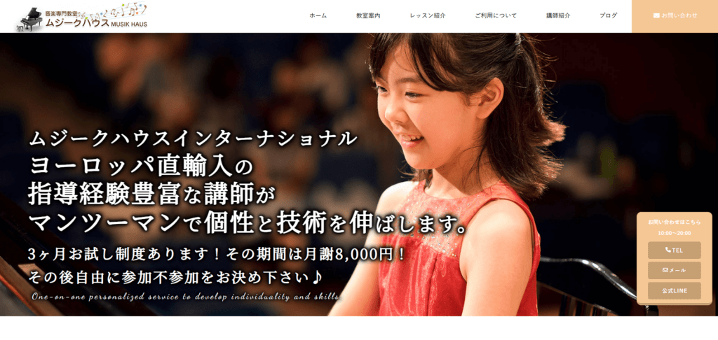 | 特徴 | ムジークハウスインターナショナルは、ヨーロッパ直輸入の指導法と豊富な指導経験を持つ講師陣が、マンツーマンで一人ひとりの個性と技術を伸ばす音楽専門教室です。3ヶ月お試し制度(期間中月謝8,000円)をご用意し、その後は自由に継続の可否をお選びいただけます。リズムを核にした実践的なレッスンで、生きた音楽のよろこびを体感していただけます。各種コンクール入賞者や長期在籍の生徒が多数在籍し、東京芸術大学をはじめとする有名音楽大学への進学実績もございます。教室は竹ノ塚、日高、飯能の各拠点で開講し、通いやすい曜日設定で柔軟に対応いたします。最新情報は公式LINEでも配信しております。体験やご相談はお気軽にお問い合わせください。 |