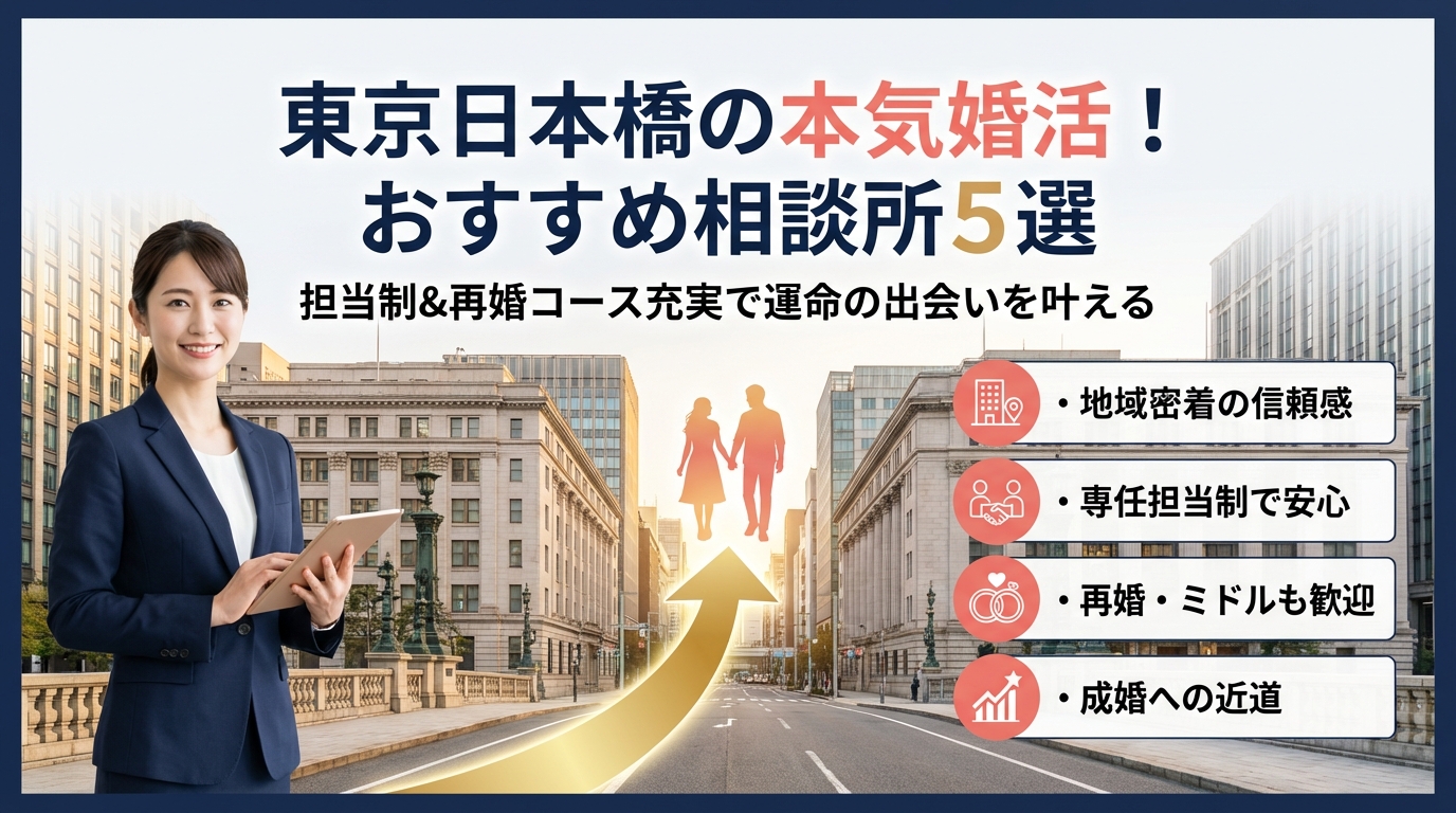 本記事は、日本橋エリアの結婚相談所を仲人型・データマッチング型・オンライン型まで横断比較しつつ、「売れ残り」「男がやばい」「厳しい現実」といったネガティブな評判を、実際の会員データと現場感で分解します。そのうえで、20代・30代・ハイクラスそれぞれが、どのタイプの相談所と相性が良く、どのくらいの期間と総額で成婚を狙えるのかを具体的に描きます。さらに、日本橋での無料カウンセリングを使い倒すための質問テンプレート、成婚の定義やサポート範囲の見抜き方まで踏み込み、ランキングや口コミでは見えない「本気を支える相談所」の条件を明らかにします。この記事を読まずに入会先を決めること自体が、最大のリスクになります。
