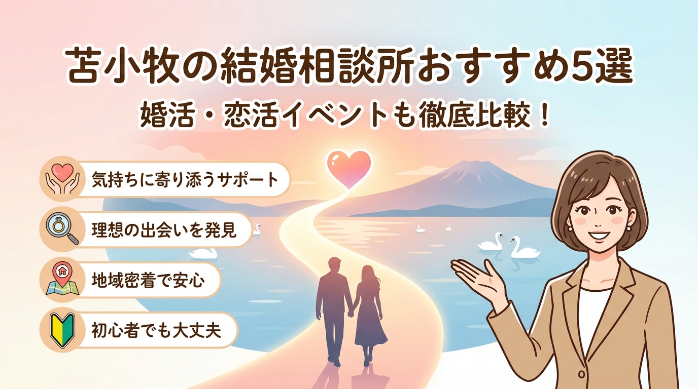 婚活アプリや街コン、苫小牧の出会いイベントを一通り試しても結婚に近づいた実感がないなら、今のやり方はあなたの時間と気力を静かに削っています。同じ「結婚相談所」でも、ただ会員データをマッチングして紹介するだけのサービスと、仲人やカウンセラーがあなたの気持ちに寄り添いながら活動プランやペースを一緒に設計する相談所では、数カ月後の現実がまったく変わります。IBJやTMS加盟店、札幌の大手エージェント、苫小牧の地域密着サロンはどれも候補になりますが、決め手になるのは規模や会員数よりも「どこまで本音で相談できるか」「婚活疲れを前提に設計されたサポートかどうか」です。この記事では、苫小牧市と周辺エリアの結婚相談所をタイプ別に比較し、料金だけでは見抜けないサポートの濃さ、途中でくじけそうになった会員をどう立て直しているかといった現場の実態まで踏み込みます。そのうえで、20代後半から50代まで年代別に最適な選び方と、無料相談で投げかけるべき具体的な質問を整理しました。ここで整理されている視点を知らないまま1社に入会すると、安い料金プランに惹かれて「放置される相談所」を選ぶリスクが一気に高まります。苫小牧で心が折れない婚活をしたいなら、まずはこの記事全体をあなたの判断基準づくりに使ってください。