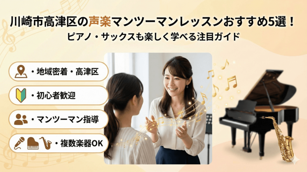 神奈川県川崎市高津区で声楽のマンツーマンレッスンを選ぶときは、体験レポートや講師紹介、コース比較の関連記事を横断して読むのが近道です。体験記事では実際のレッスン内容や所要時間、練習課題が具体的に分かり、初心者が不安を感じやすいポイント(高音、音程、呼吸)へのアプローチを事前に把握できます。講師紹介は経歴だけでなく、得意ジャンルや指導スタイル、社会人向けの時間帯可否が重要です。コース詳細は月謝や相場、単発との違いを整理し、横浜や東京方面へ通う場合との比較検討にも役立ちます。以下の導線を活用して、迷いなく次の一歩へ進みましょう。