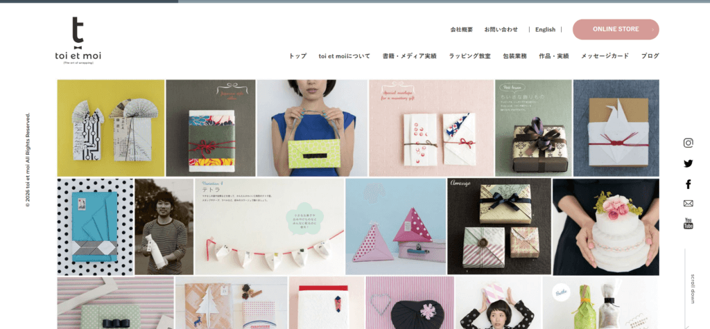 | 特徴 | toi et moi(トワ エ モワ)は、「気持ちをもっとかたちに」をコンセプトに、贈り物に感動をプラスするラッピングを提案いたします。書籍出版やメディア出演実績をもつ経験豊富な講師が、「包むこと」の基本から応用まで丁寧にお伝えするラッピング教室を開講し、コーディネーター資格取得コースや1日レッスン、オンラインレッスンなど多彩なプログラムをご用意しています。さらに、個人のお客様から企業様まで、ギフト包装やパッケージデザインなどの包装業務も承っております。お預かりしたお品物一つひとつに心をこめ、現代的なデザインと確かな技術でワンランク上のラッピングをお届けいたします。贈る人も贈られる人もワクワクする記憶に残るギフトづくりを、トータルでサポートいたします。 |